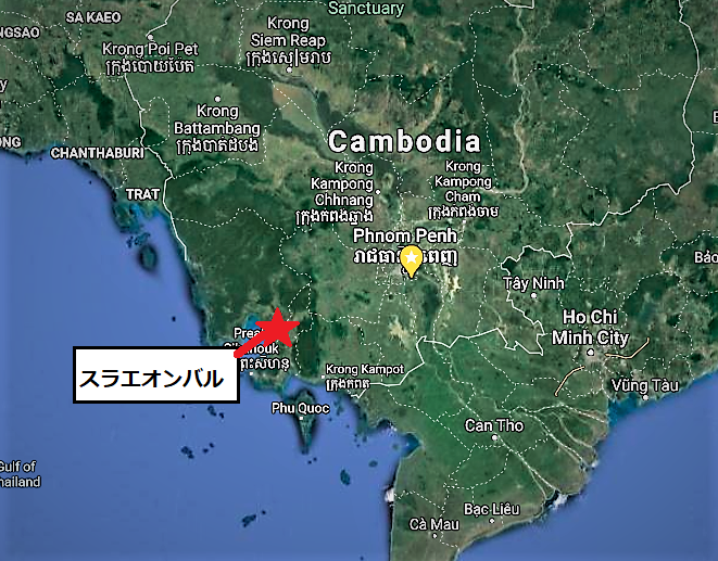 カンボジアの国道4号線は、首都プノンペンから西にまっすぐカンボジア随一の海港シハヌークビルに向かう。プノンペンの街を出れば、高速道路のように車がスピードを上げて走る立派な舗装道路だ。中央分離帯はなく、無理な追い抜きをする車がいるとスリル満点でもある。2時間も走ると道は少しだけ標高を上げ、カンボジア南西部のエレファント山地を東西に通る標高100メートルの峠を抜ける。峠には交通安全にご利益があるという小さな祠があり、往来の車の多くが停まって人々が手を合わせる。峠を降りてしばらくすると、タイとの国境の町コッコンへ向かう分かれ道が右手に見える。そこを入ってから十キロほど走ったタイ湾沿いの小さな町スラエオンバルの近くに、ティさんの家がある。プノンペンからスラエオンバルまでは150キロほど、車で3時間強の道のりだ。