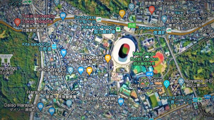 ひっそりと?TOKYO2021の開会を待つ国立競技場。競技場横のホープ軒でラーメンを食べる選手はいるのだろうか? (Googleマップより)