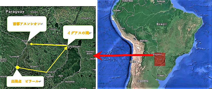 パラグアイの南西部に位置するピラールから、南東部にあるイグアスの滝に寄って、ほぼ中央西寄りの首都アスンシオンに向かった。パラグアイの南部をぐるりと反時計周りに走ったことになる。
