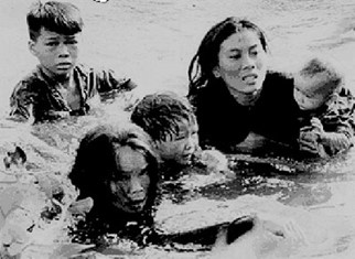 1965年9月6日、アメリカ軍部隊はクィニョン北方のロックチュアン村に攻撃をかけた。砲火に包まれて戦場と化した村から、二組の母子が必死にアン河を渡る。沢田のカメラがとらえたのは、1歳の赤ん坊グエン・チ・クエちゃんを抱えた若い農婦レ・チ・ダア(当時24歳、右)、そしてチャン・チ・バア(49歳、手前)と彼女の次男グエン・ゴク・アン君(12歳、左)と長女チ・チンちゃん(8歳、中央)の姿だった。沢田が撮ったこの写真は、世界各地の新聞・雑誌に掲載され、1966年度のピュリッツアー賞をはじめ、数々の写真賞を受賞。ベトナム戦争の悲惨さを改めて訴えるものとなった。[1]