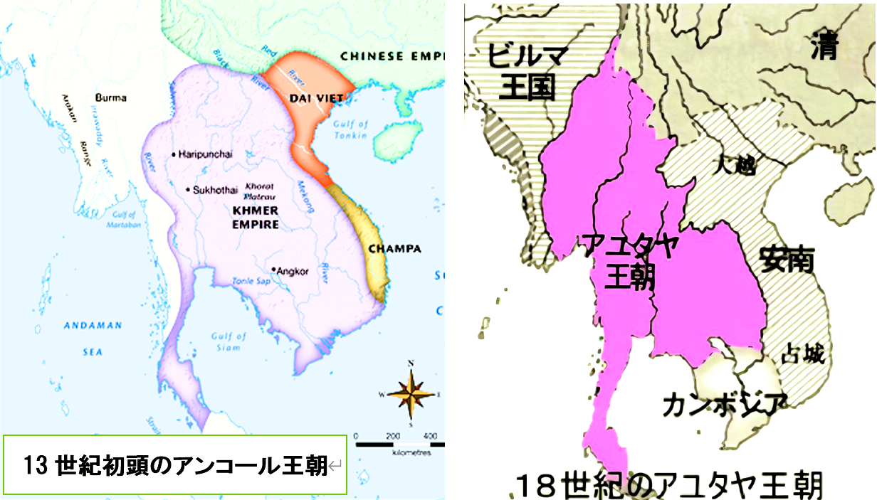 冒頭の写真、左がアンコール王朝の最大領地(13世紀初頭ごろ)、右がアユタヤ王朝の最大領地(18世紀前半)を示す東南アジア大陸部の地図です。プノンペンの王宮見学に行けば左の図と似たものを、バンコクの王宮を訪問すれば右の図と似たものを、観光コース順路のどこかに飾られているのを見ることができるはずです。
