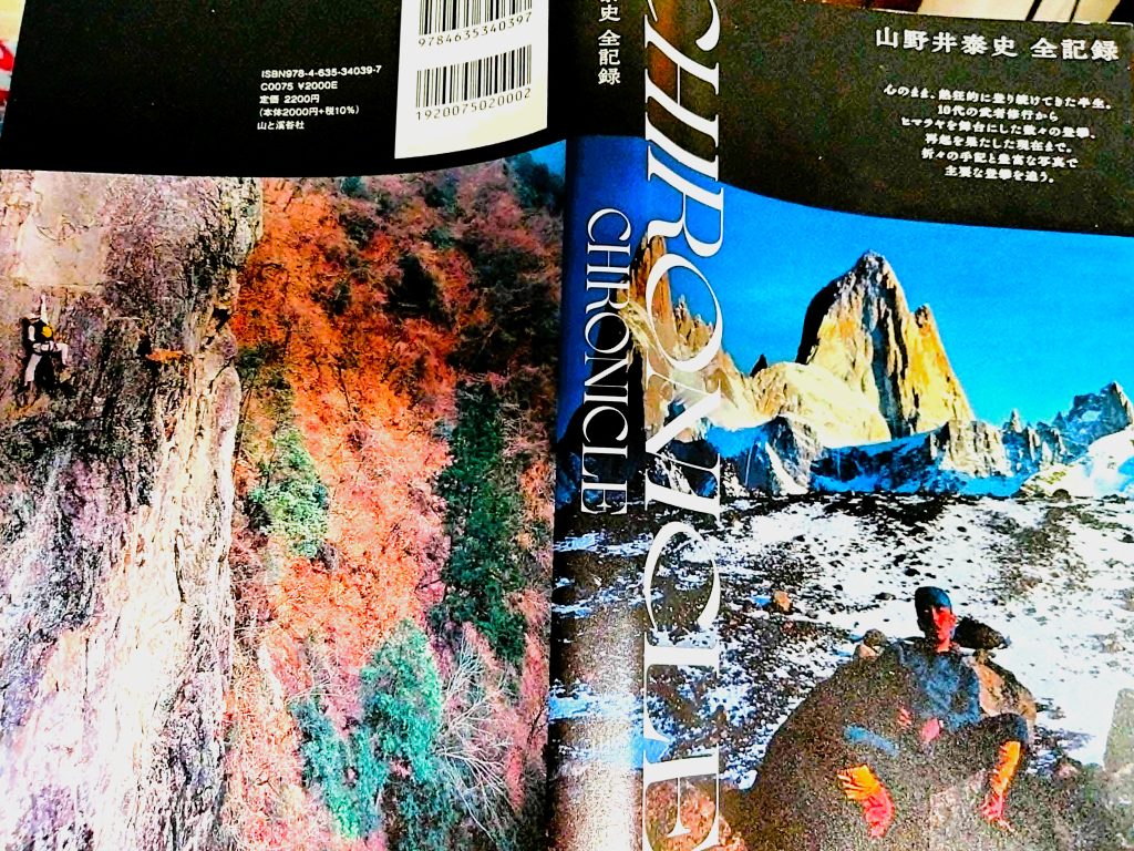 『CHIRONICLE 山野井泰史 全記録』の、表表紙と背表紙。写真は帯です。左手の裏表紙に重なる写真の中、左手ちょい上に壁を命綱なしで登っている山野井さんが写り込んでいます。息をのみます。(写真右手 南米パタゴニア フィッツロイ/1989年、写真左手 奥多摩越沢(こいざわ)バットレス/1998年) 蛇足ですが、右手の写真、フィッツロイを台風並みの風とマイナス30度の冬季に初単独登頂したときのもの。右手は1998年、ネパールのクスムカングル東壁(標高差1200メートル、未踏)に単独で臨み、22時間の連続登攀に成功する、その前の日本での訓練時の写真だろうと思われます。越沢バットレスは、高差80メートル/幅70メートルを誇る奥多摩を代表する壁だそうです。バットレスというのは、(いただき)や稜線に向かってそれを支えるように切り立っている岩壁、のことです。